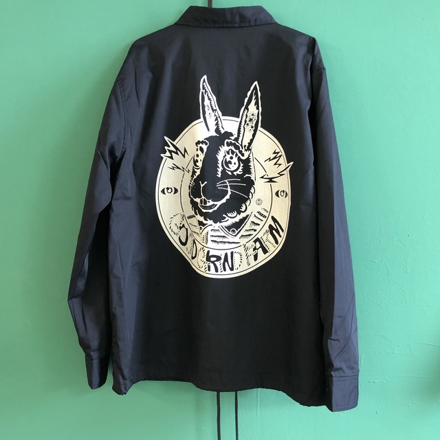 GGF RABBIT コーチジャケット BLACK DESIGNED by OKANOMASATO (GRINDLODGE) ボディ:UNITED ATHLE T/Cコーチジャケット 素材:ポリエステル65%、綿35% ウェザークロス <裏地>ポリエステル100% ボディーカラー:ブラック プリントカラー:ホワイト